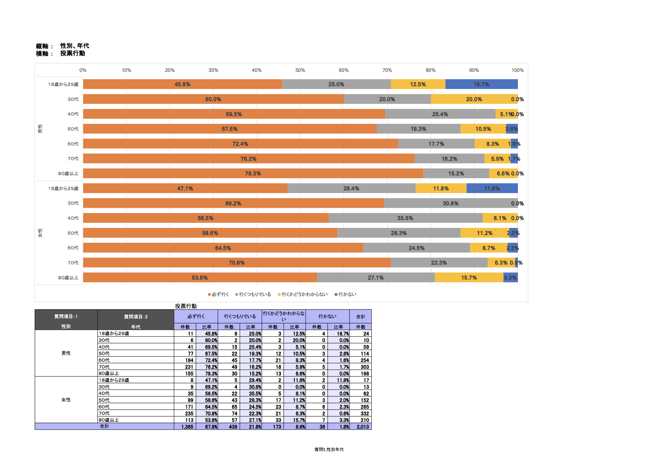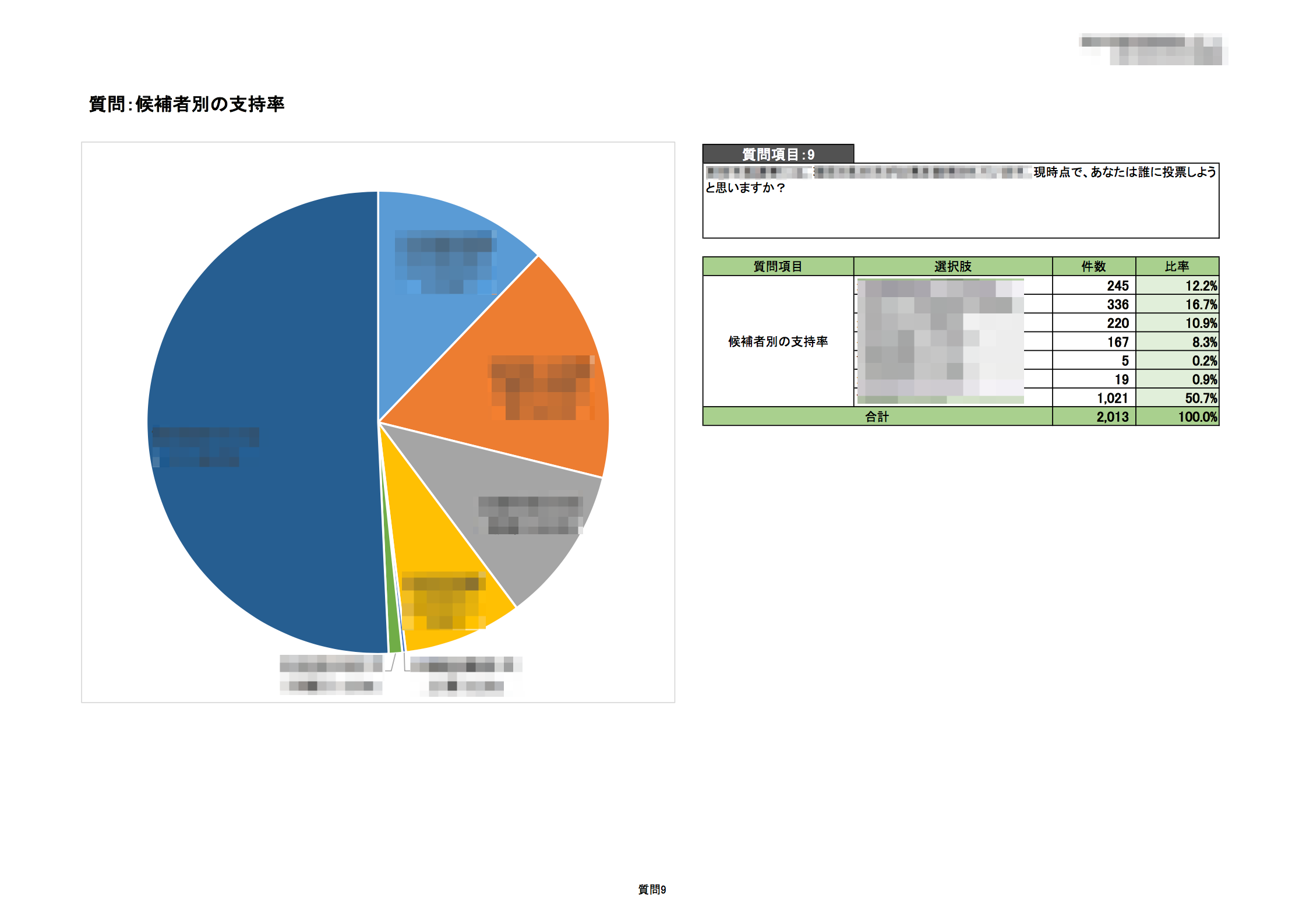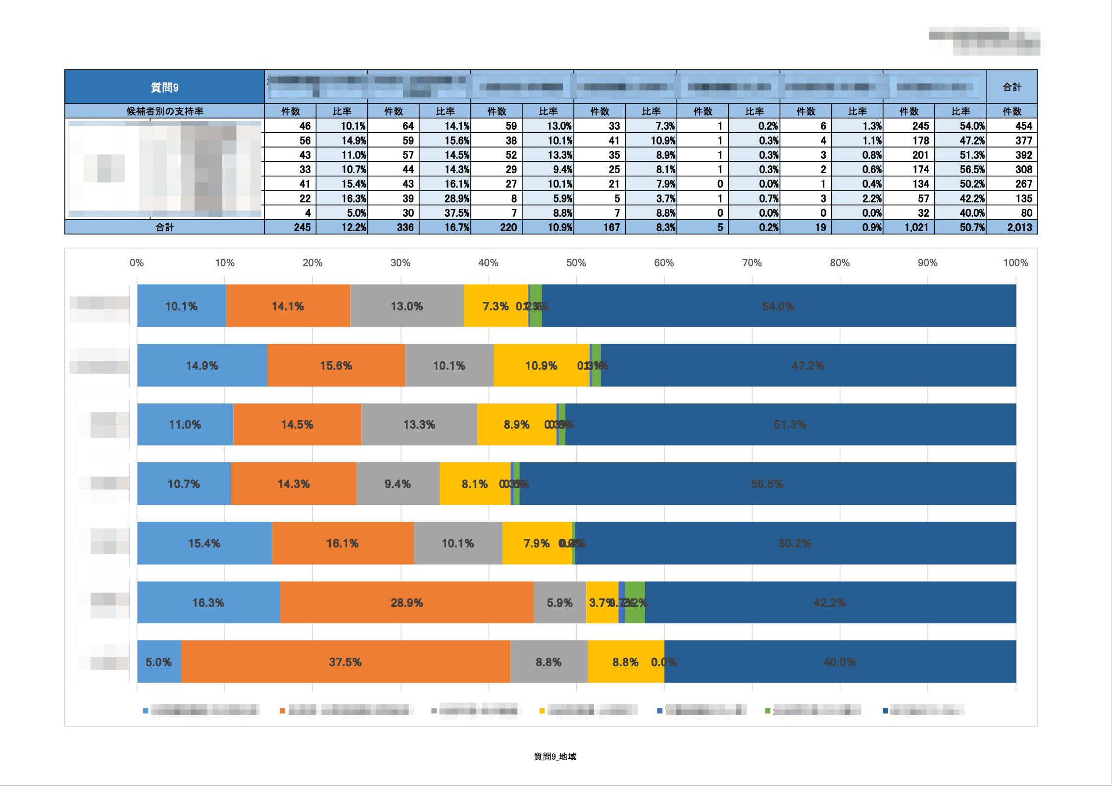 選挙は時間が勝負です。調査日より1営業日以内に、調査結果の集計レポートをメール(PDF形式)にて納品します。集計方法については、全体集計、クロス集計(男女別集計、年代別集計、支持政党別集計など)3次元クロス集計(性別年代別集計など)、地域別集計が可能です。調査レポートは、数種類のグラフを併用し、回答比率が把握しやすい独自形式を採用しています。