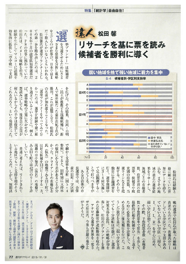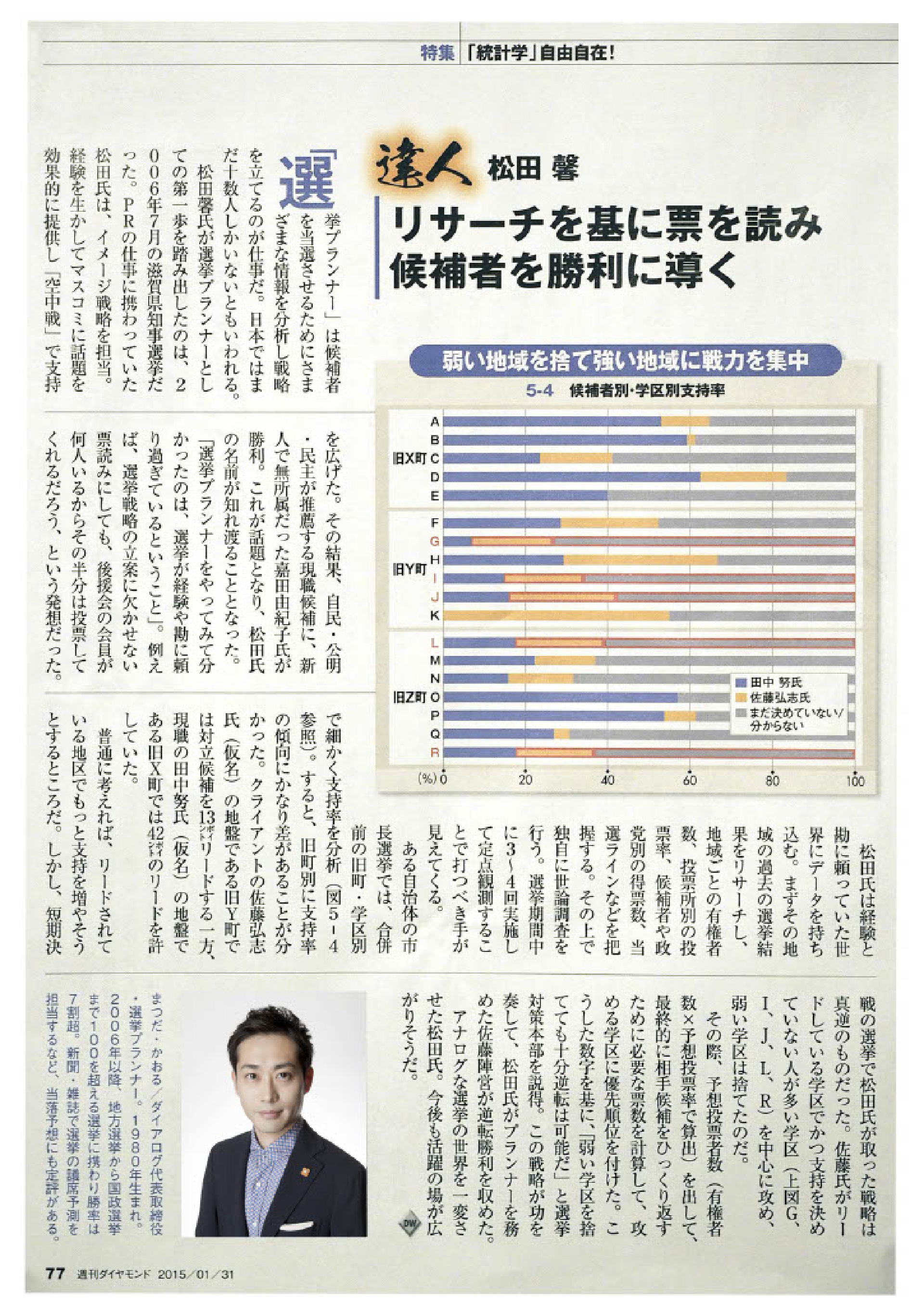 正確な現状把握は戦略を立案する上での必須条件ですが、調査結果を正確に分析できなければ宝の持ち腐れです。弊社では正確性の高い調査の実施はもちろん、調査設計・質問文と回答設問作成から集計結果の分析までを選挙プランナー松田馨が担当します。さらに、調査結果を今後の政治活動・選挙運動にどう活用していくのか、当選に向けてどの地域でどのような活動をすべきなのかといった「調査結果に基づくアドバイス」もご提供しております。